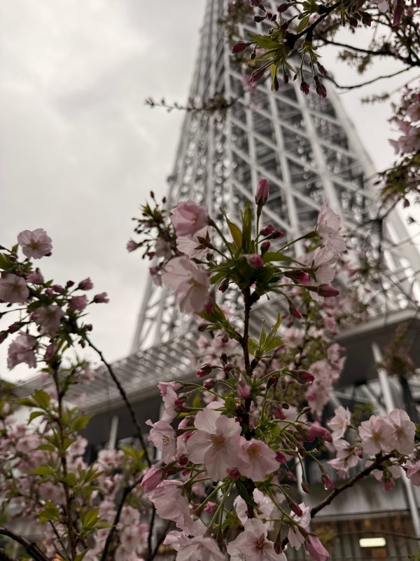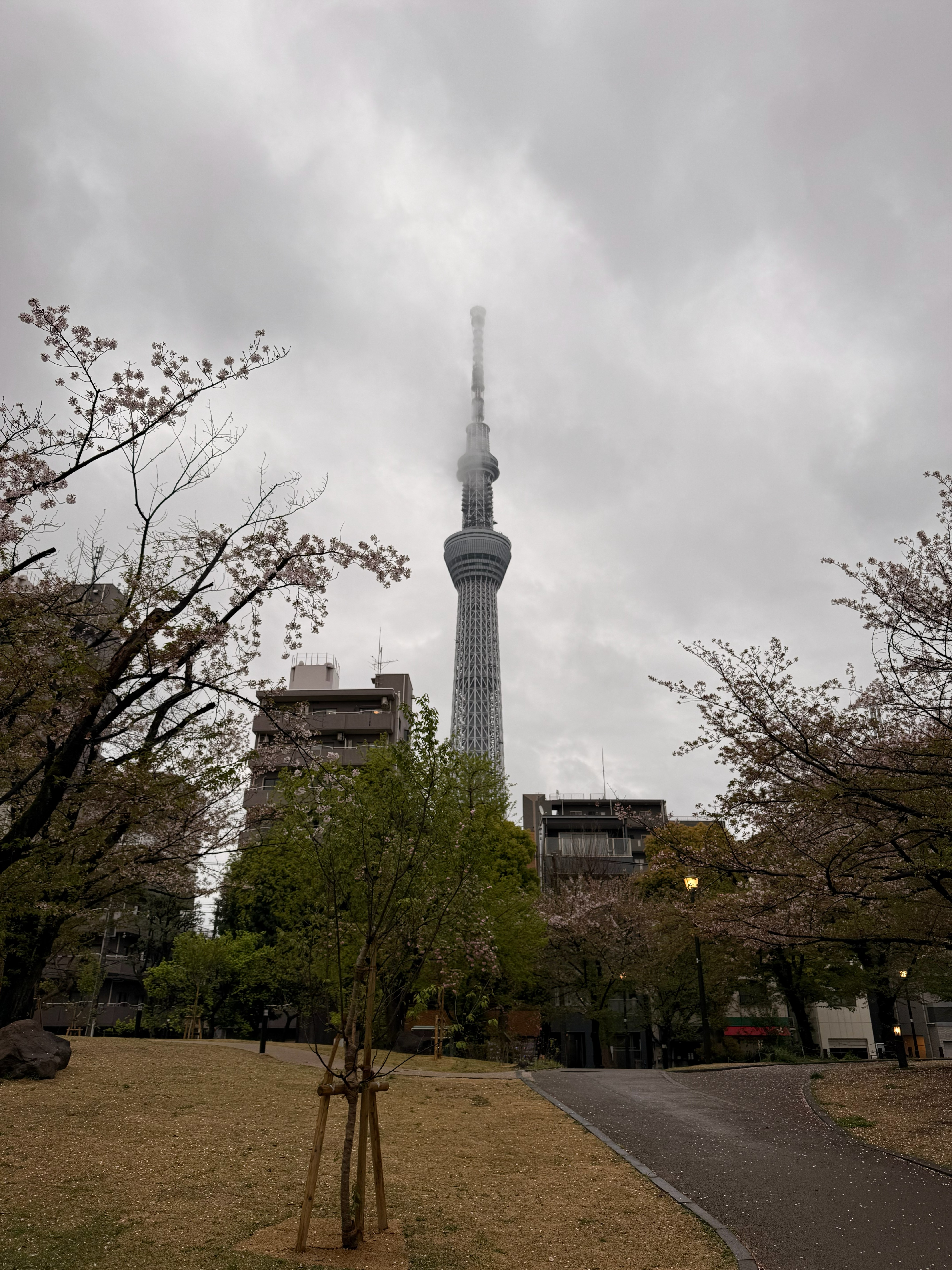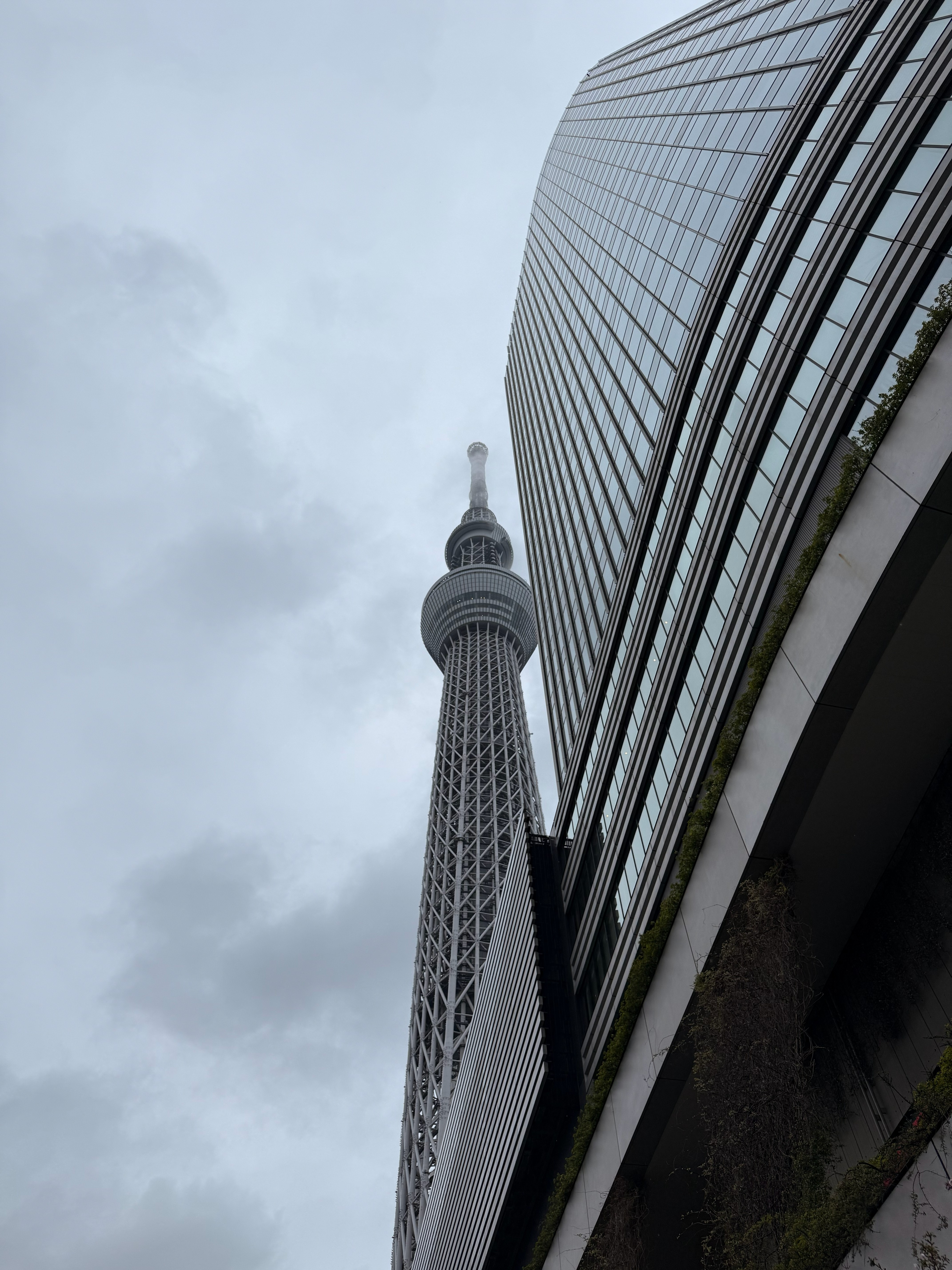 По набережной мы дошли до одного из входов на территорию императорского дворца. Так как туристов туда не пускают, то сам вход не особо чем-то выделялся. Да и в начале моста всё было оцеплено одной полицейской машиной. Поняв, что рядом особо нечего делать (вокруг всё так же был деловой район с высотными офисными зданиями), мы решили двинуть обратно в отель, чтобы отдохнуть и пообедать. А после этого мы решили съездить посмотреть ещё одну высокую башню: Tokyo Skytree. Если токийская башня выглядела внушительно, то “небесное дерево” поражала своими размерами. Это реально огромное здание в основании которого находится здоровый торговый центр. Правда волевым решением было решено потратить время на осмотр округи, а не торговых площадей. А посмотреть здесь есть на что: красивые каналы и реки, довольно большие парки, обустроенные в традиционном японском стиле, наземное метро, по которому курсируют разные электрички.