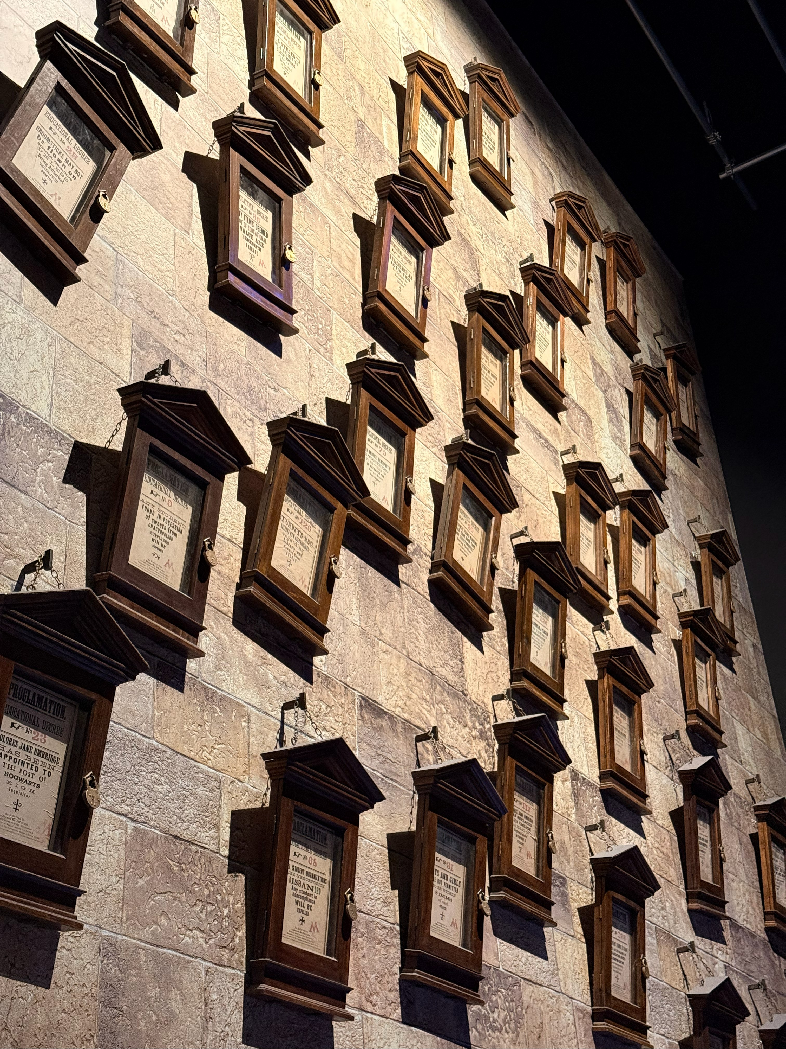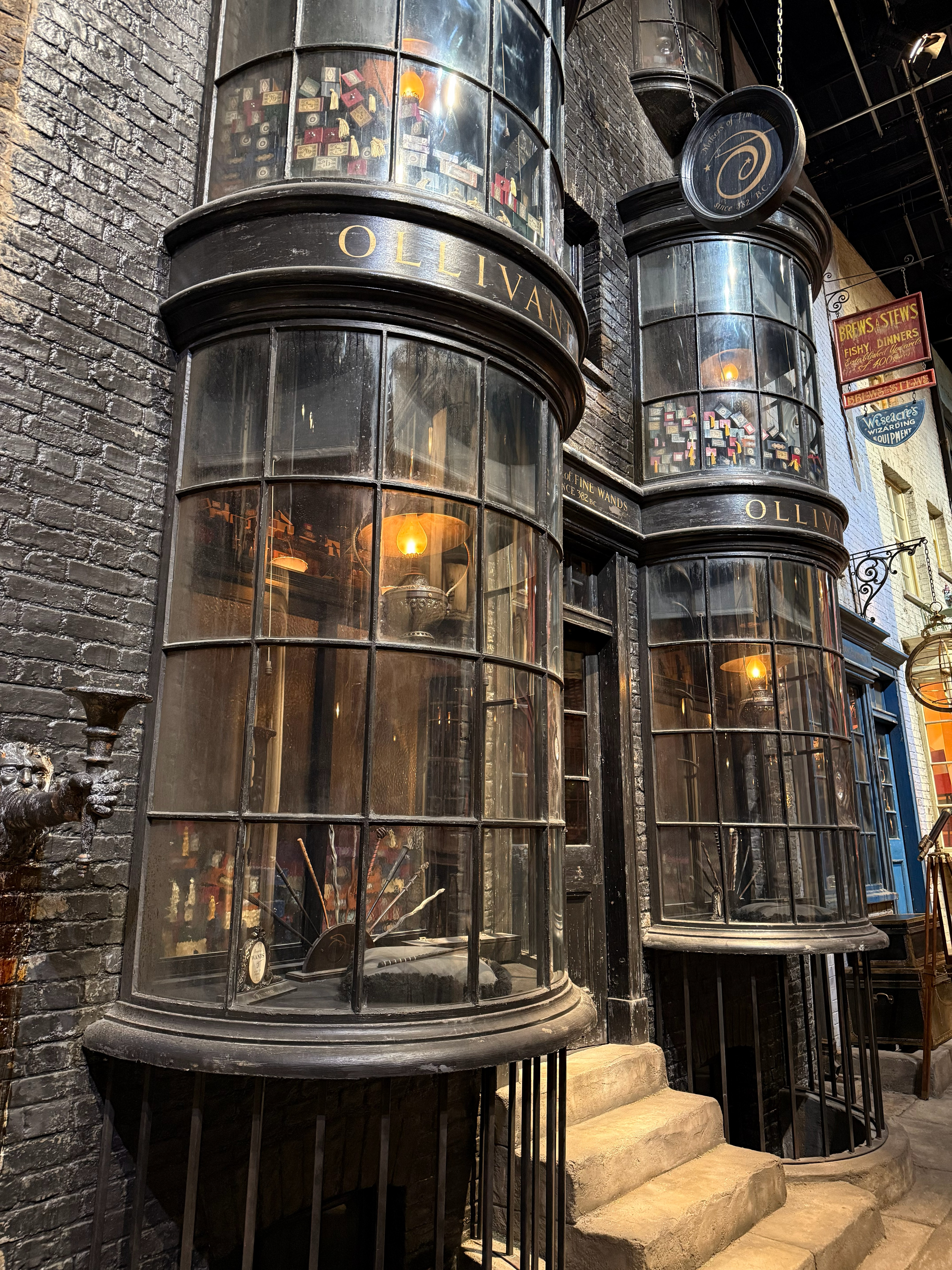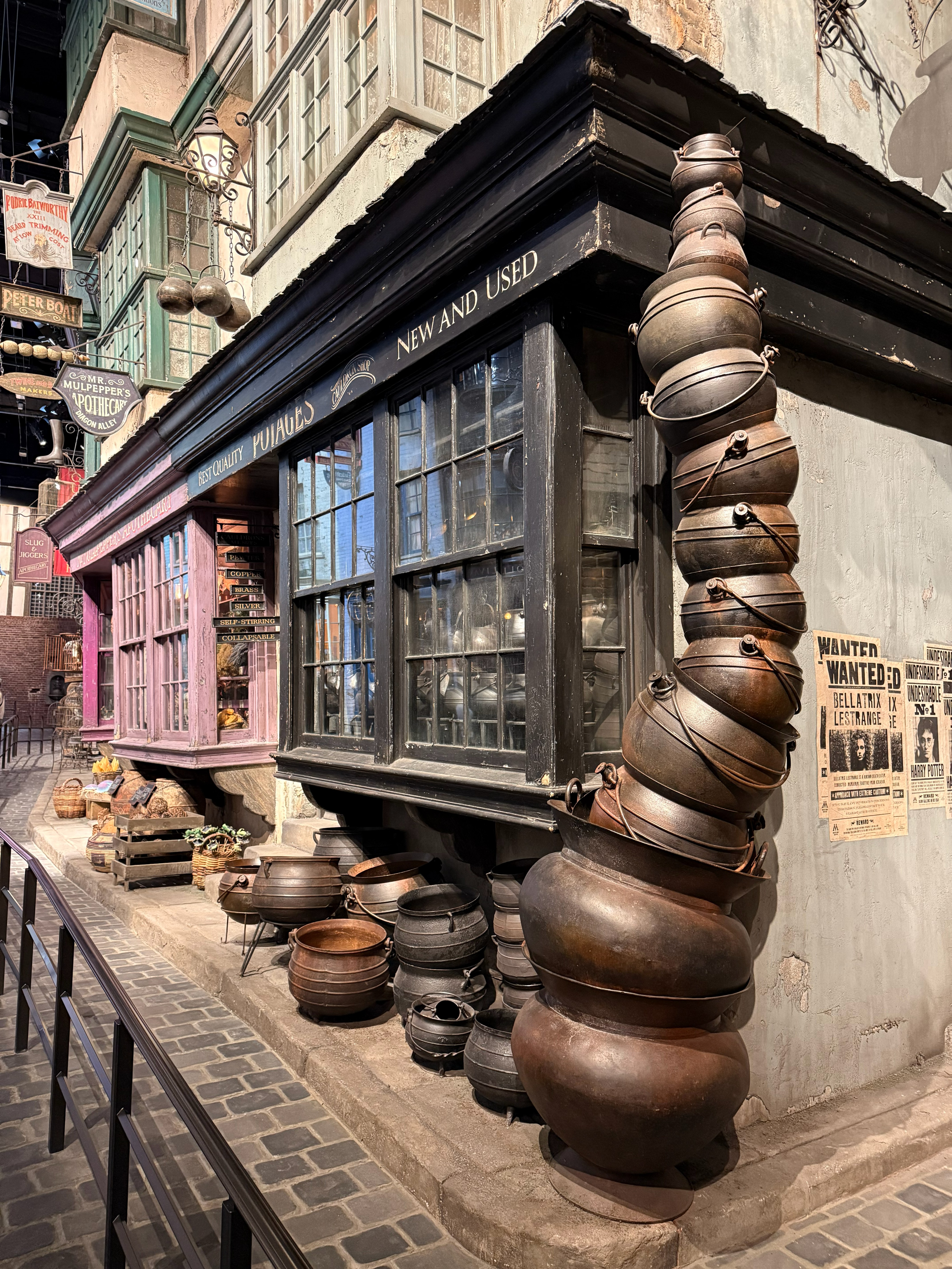 И уже увидев много достойных мест, впечатлявшись настолько, что перестаёшь ронять челюсть в каждом новом павильоне, мы увидели пик всей выставки - Косой переулок. Он невероятно потрясает соотношением масштаба к деталям. В каждое заведение можно заглянуть через окно и увидеть всё то, что мы видели в фильмах. Непередаваемое ощущение. А ещё и с динамической сменой освещения день/ночь это вообще выглядит волшебно.