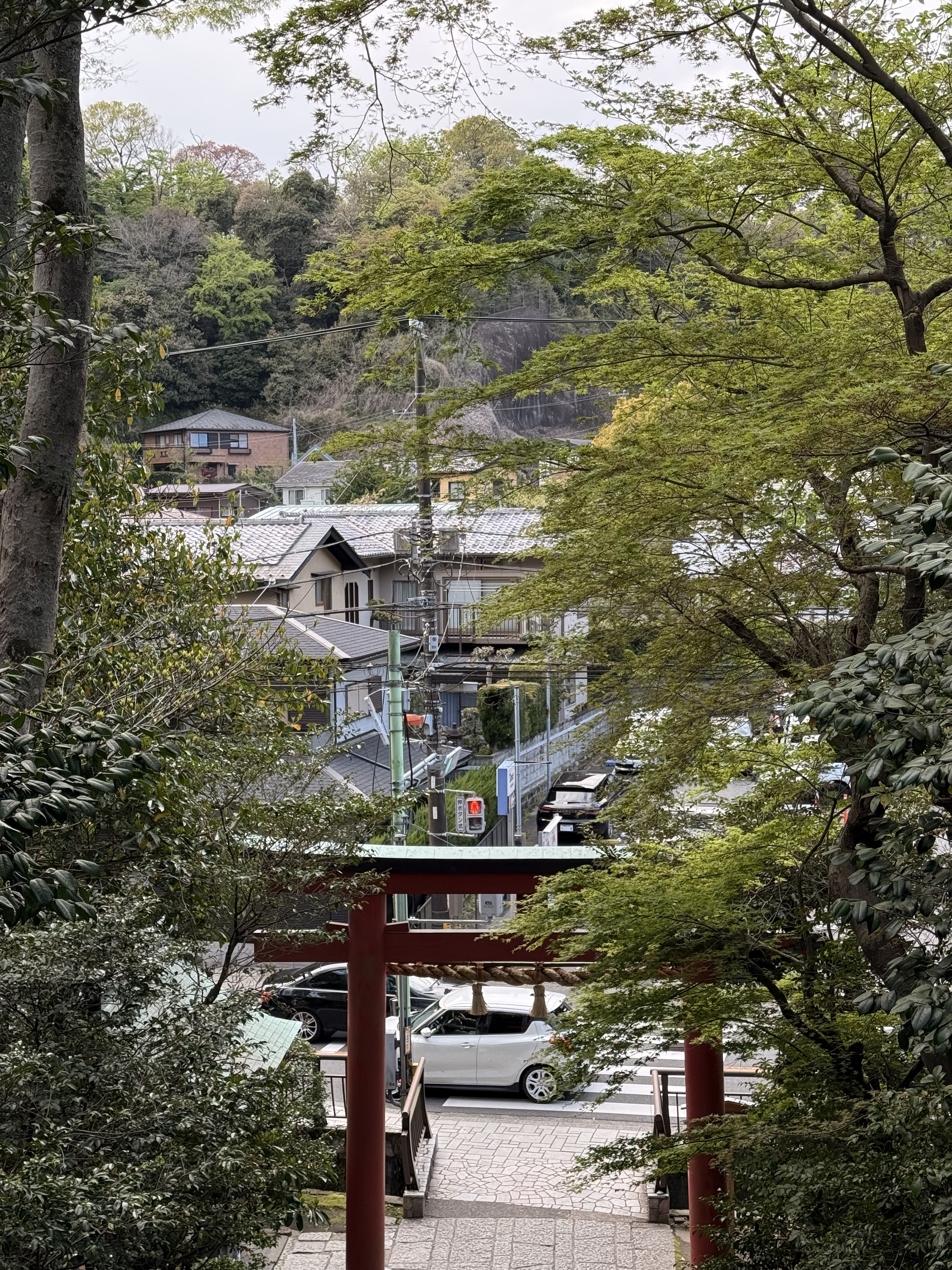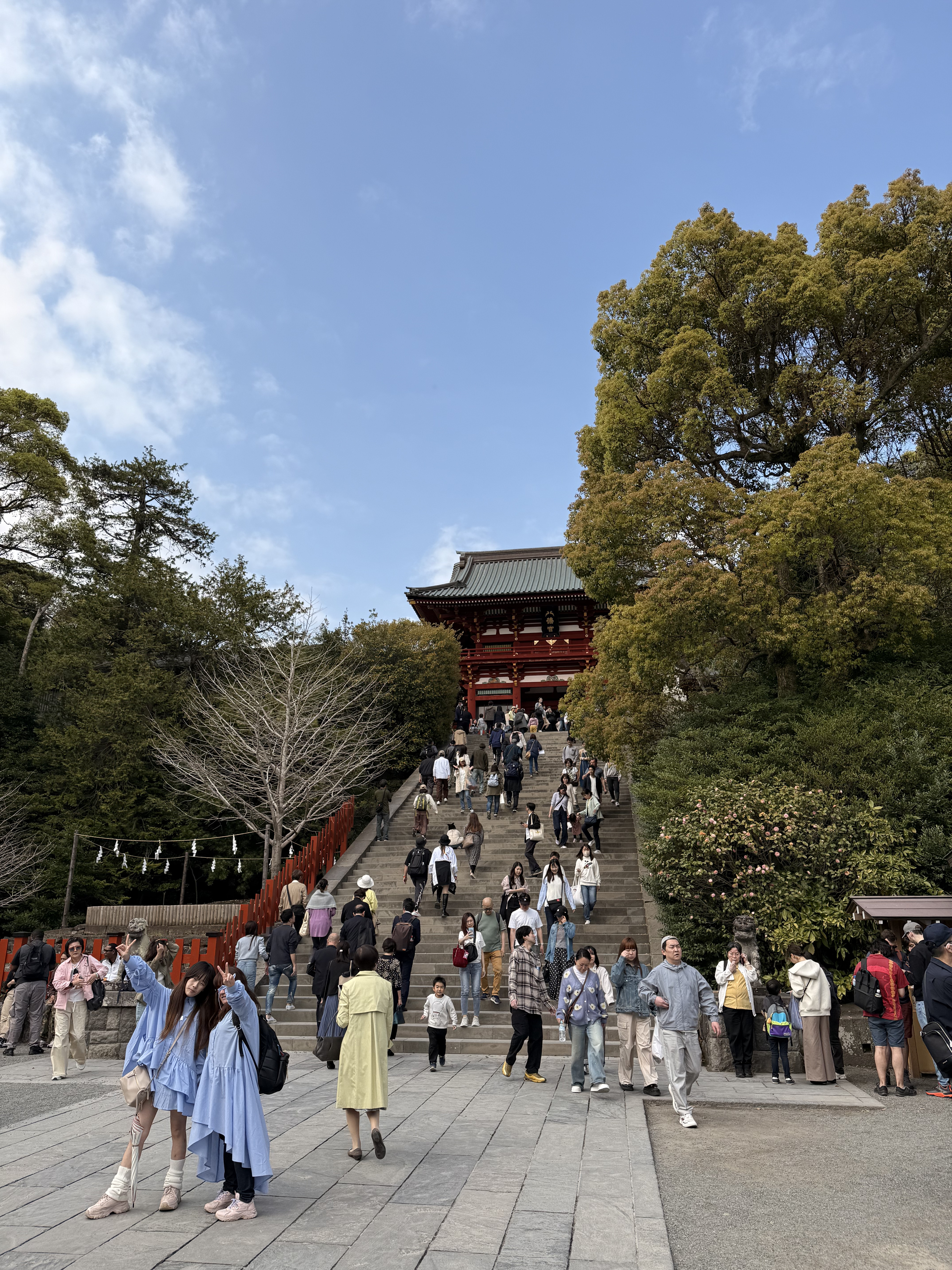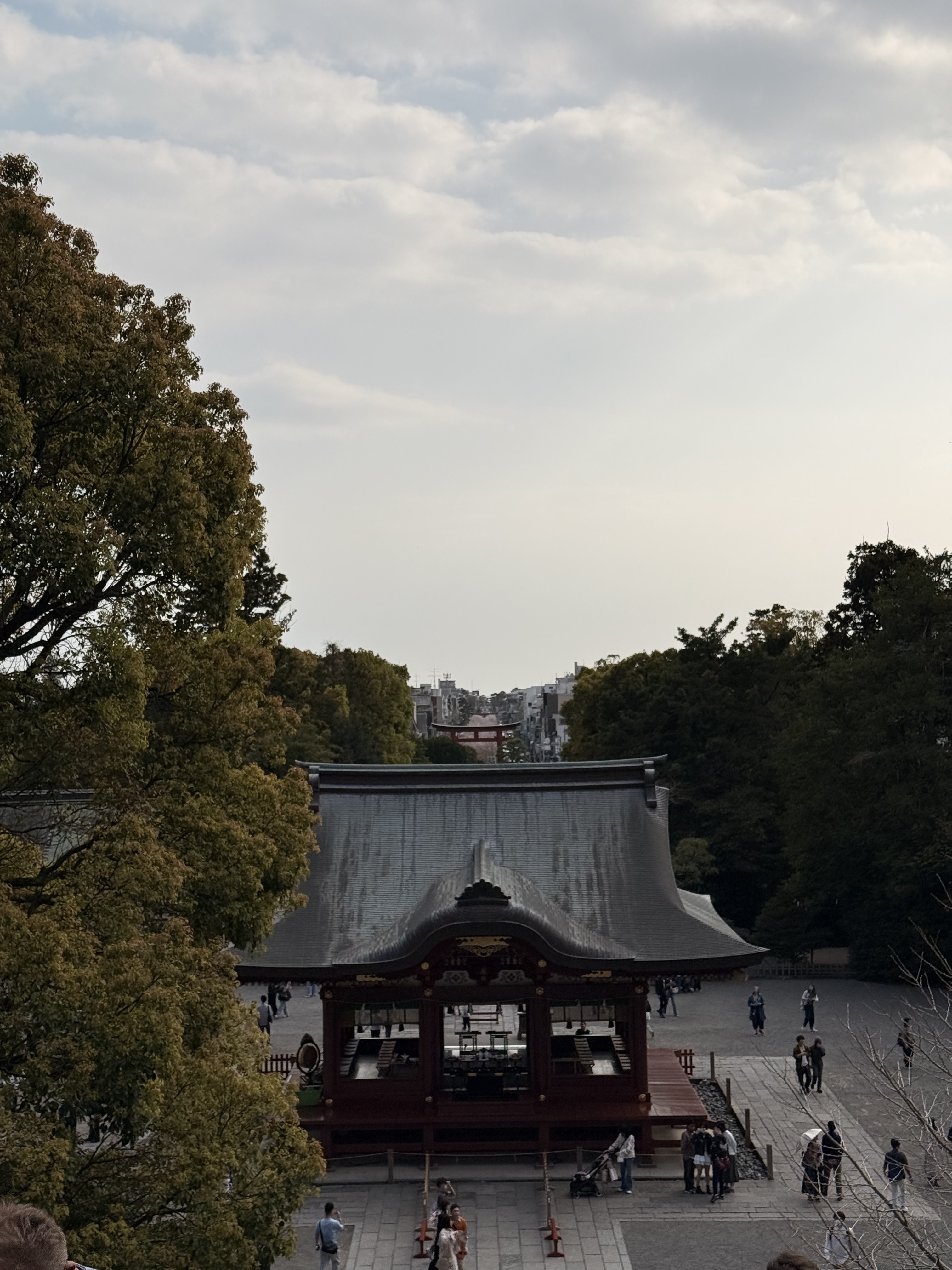 Храм Tsurugaoka Hachimangu, судя по карте, имеет большую территорию, но из-за большого количества людей казалось, что места маловато. Поэтому мы как-то быстро прошли места, которые представляли хоть какой-то интерес, и сделали вывод, что после блинчиков нужно было сразу двигать к океану, не пытаясь духовно обогатиться. Даже смотровая площадка из храма была средняя: хоть он и находится на возвышении, но не сильном, и ещё окружён со всех сторон довольно высокими деревьями.