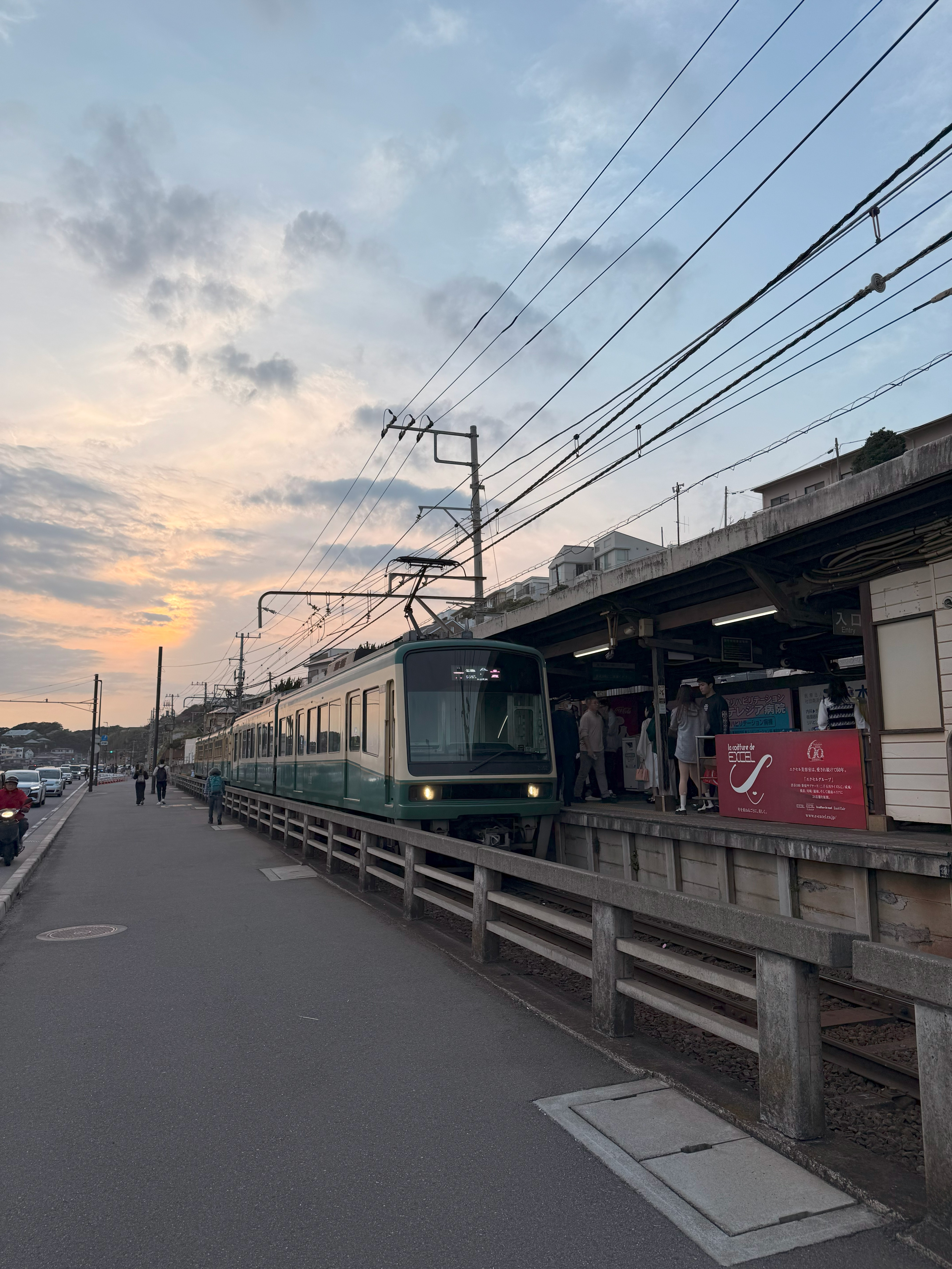 Народу на станции было мало, поэтому мы уже было выдохнули и обрадовались. Но это была ошибкой. Прибывший на станцию трамвайчик приехал прямо из ада воспоминаний о “час пик в 6 вечера после работы”. Было тяжело, но мы всё же пристроились у двери и относительно удобно проехали несколько остановок. По пути даже поразглядывали убранство местных домиков (а могли бы созерцать океан, но он был с другой стороны). Вот так началась наша поездка на станции Yuigahama: