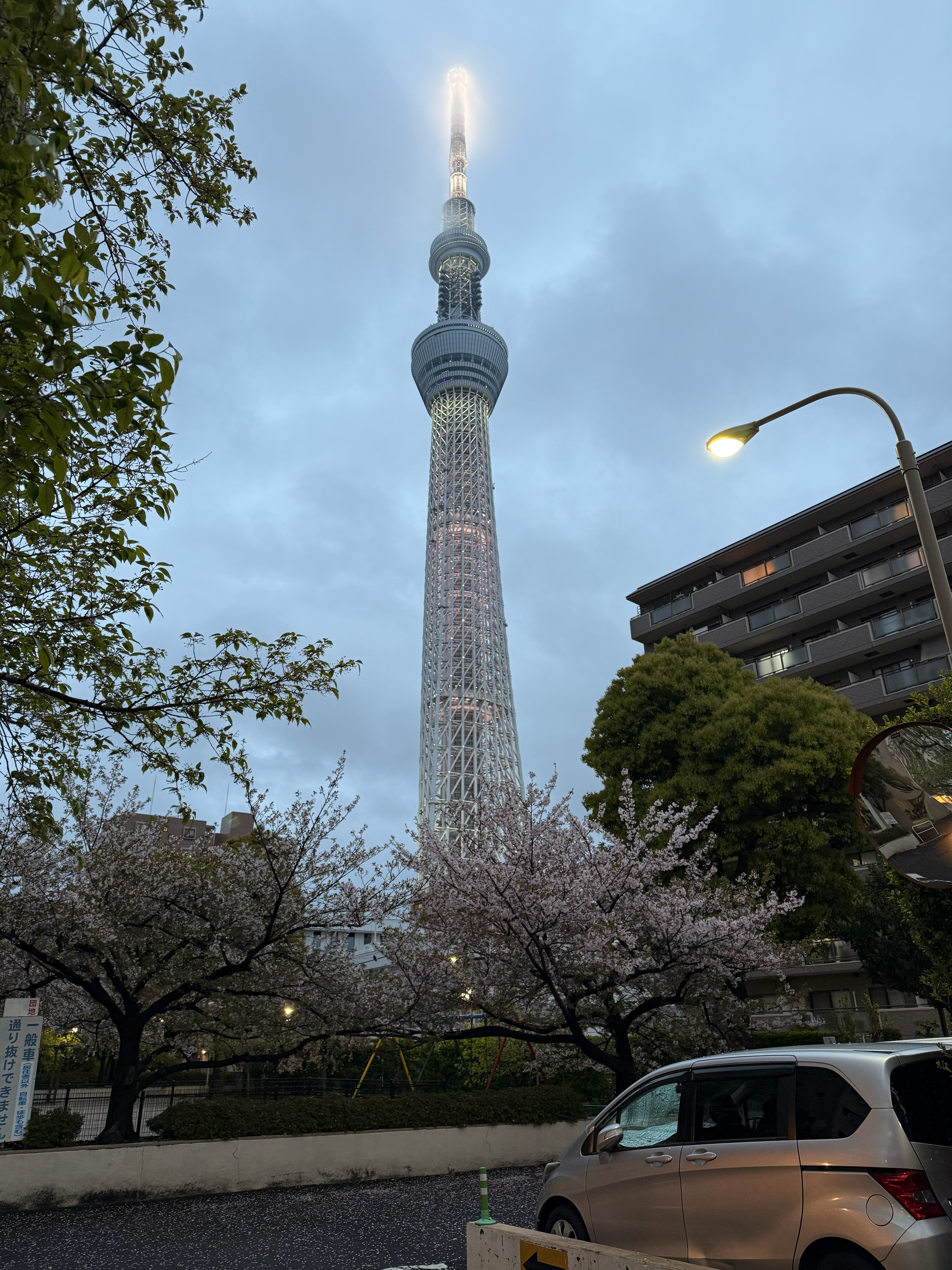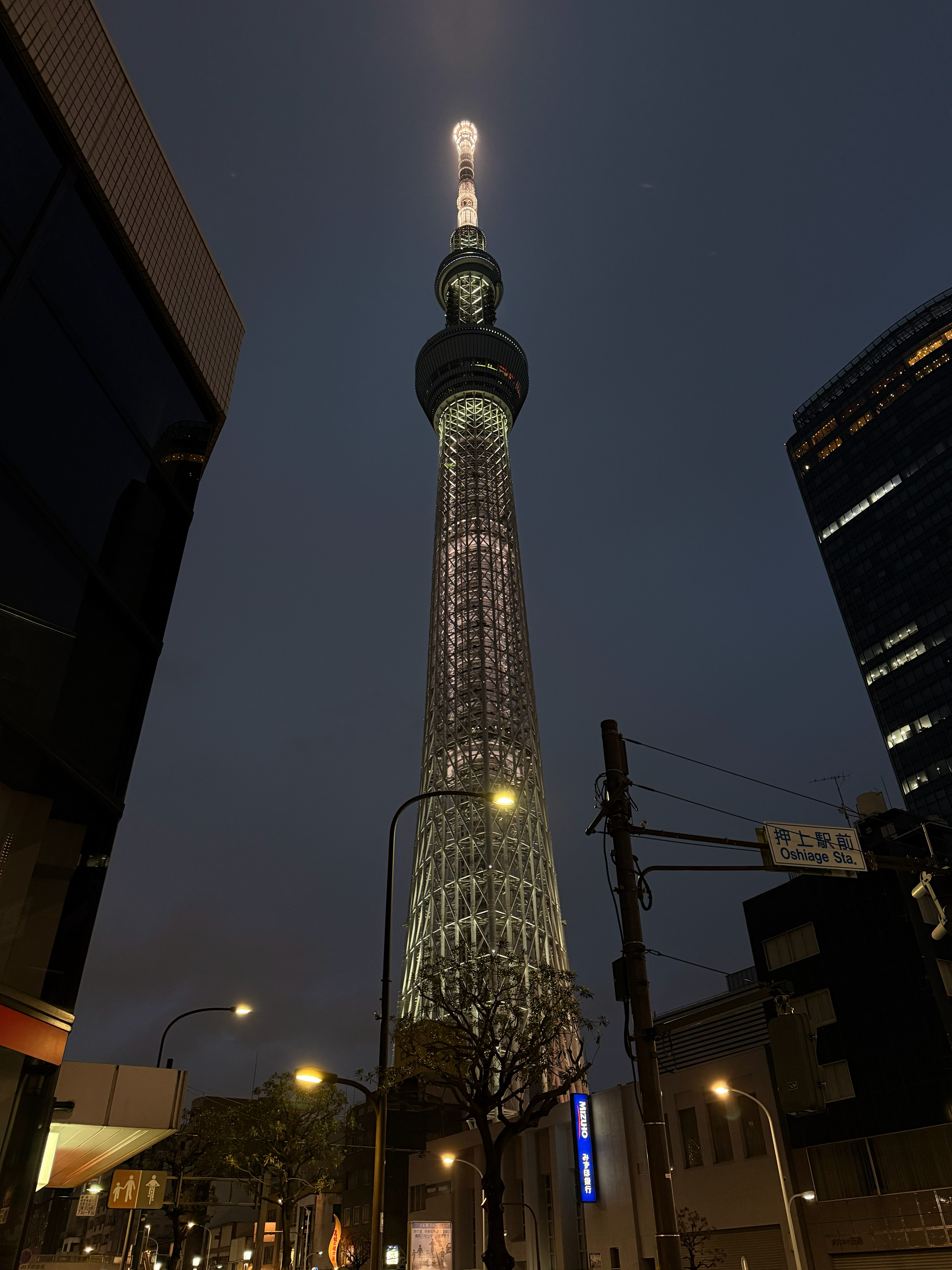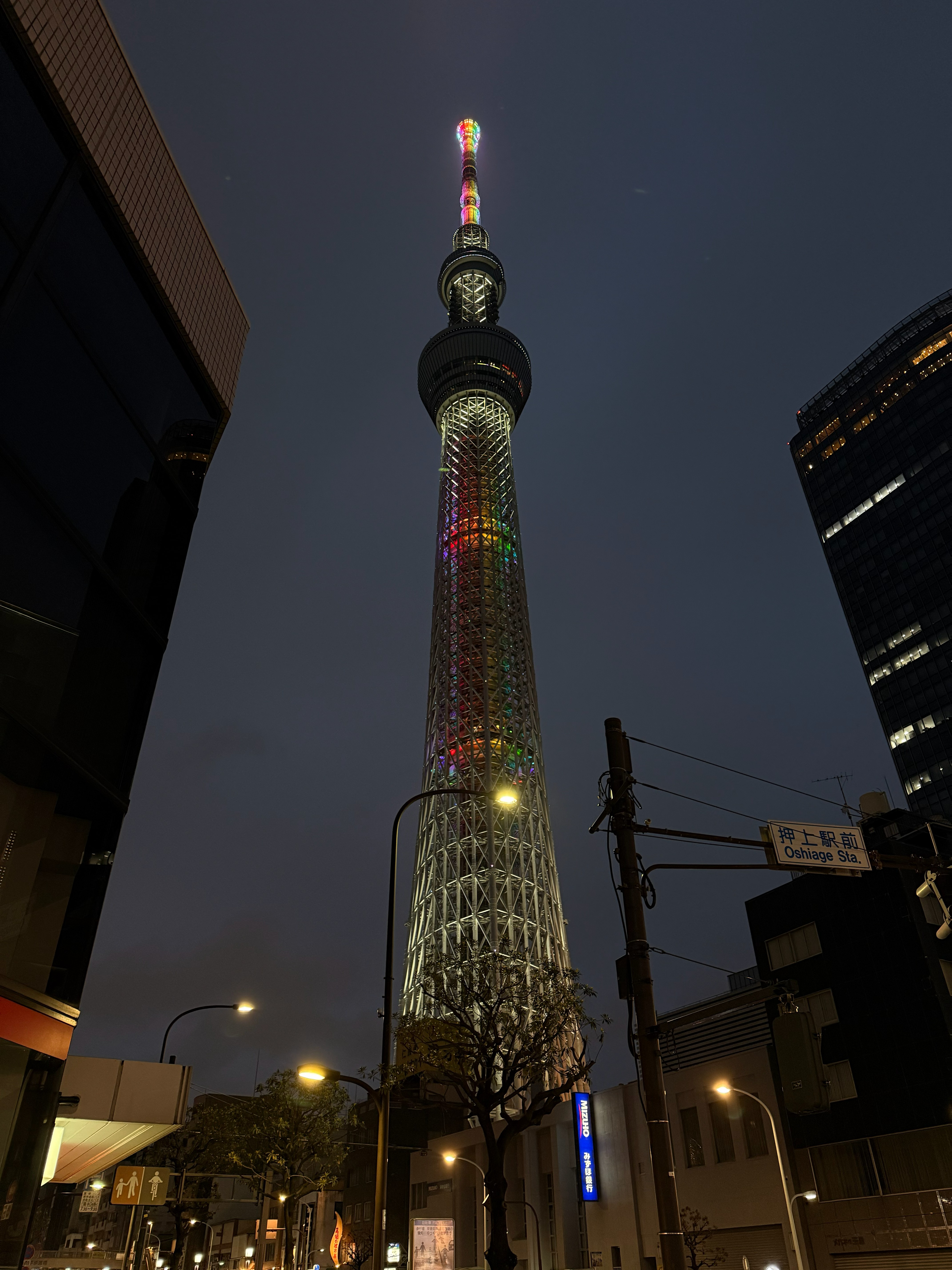 Гуляли мы долго, ждали, когда потемнеет, чтобы увидеть подсветку Skytree. За это время мы забрели в район с невысокими частными зданиями (не более 3-4 этажей). По таким районам Японии очень уютно гулять. А самое интересное, что именно этот район находился буквально в 10-15 минутах ходьбы от высоченной башни. И вот подсветку включили, когда было ещё довольно светло, поэтому изначально это не сильно впечатляет. Но когда солнце уже совсем скрылось за горизонтом, то башня заиграла совсем другими цветами. Хотя признаю, это похоже на огромную ёлочную игрушку.